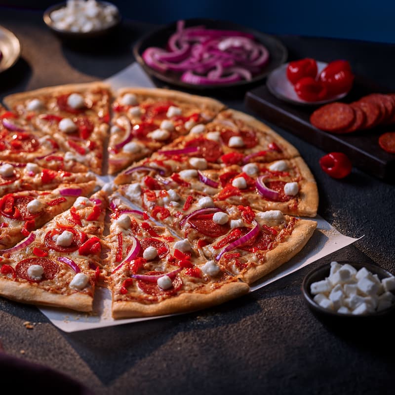 Hand stretched Italian Style crust dough topped with vine ripened tomato sauce, mozzarella, pepperoni, 'nduja, red onion & Peppadew Piquante peppers.