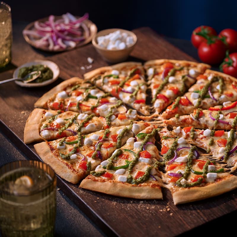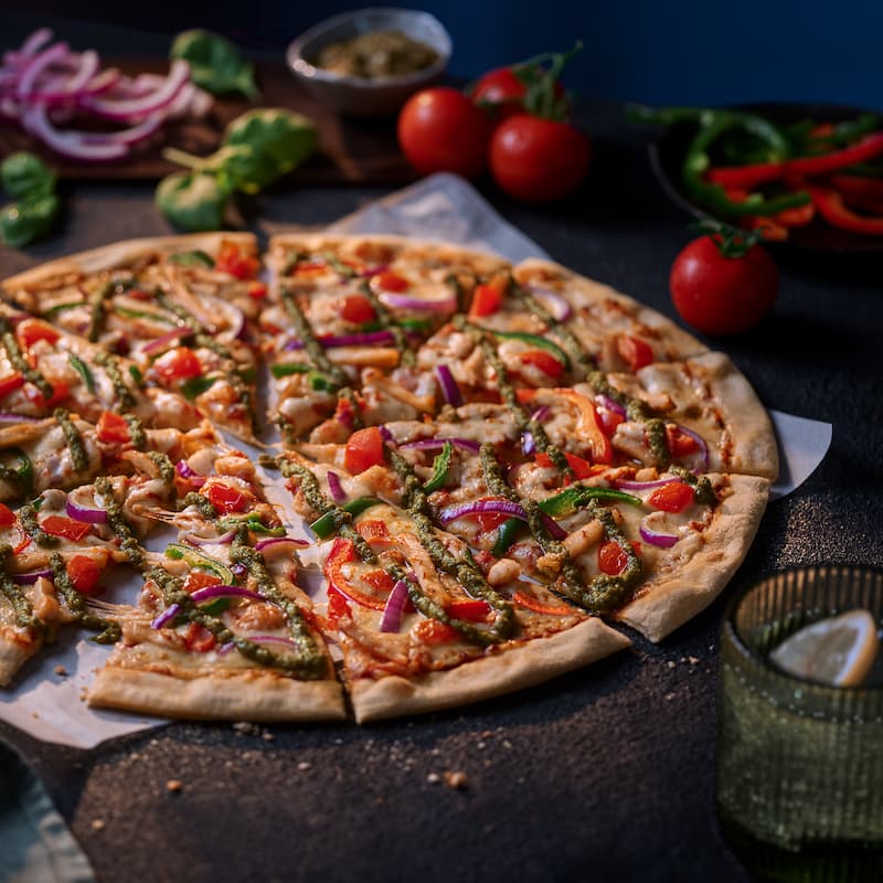 Hand stretched Italian Style crust dough topped with vine ripened tomato sauce, mozzarella, chicken breast strips, tomatoes, green and red peppers, red onion topped with basil pesto drizzle.