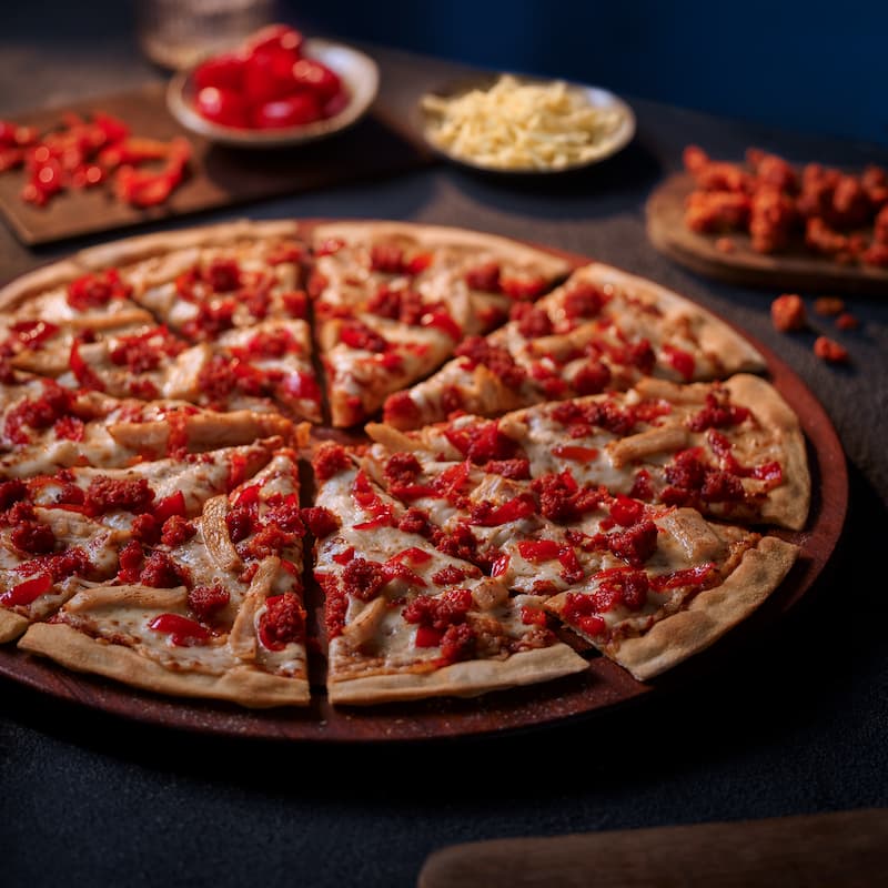 Hand stretched Italian Style crust dough topped with vine ripened tomato sauce, mozzarella, 'Nduja, chicken breast strips & Peppadrew Piquante peppers.